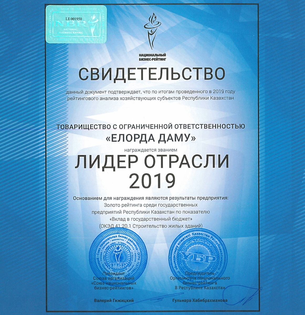 Ұлттық Бизнес-Рейтингтің нәтижелері бойынша біздің кәсіпорын «Сала көшбасшысы – 2019» атағына ие болды!
