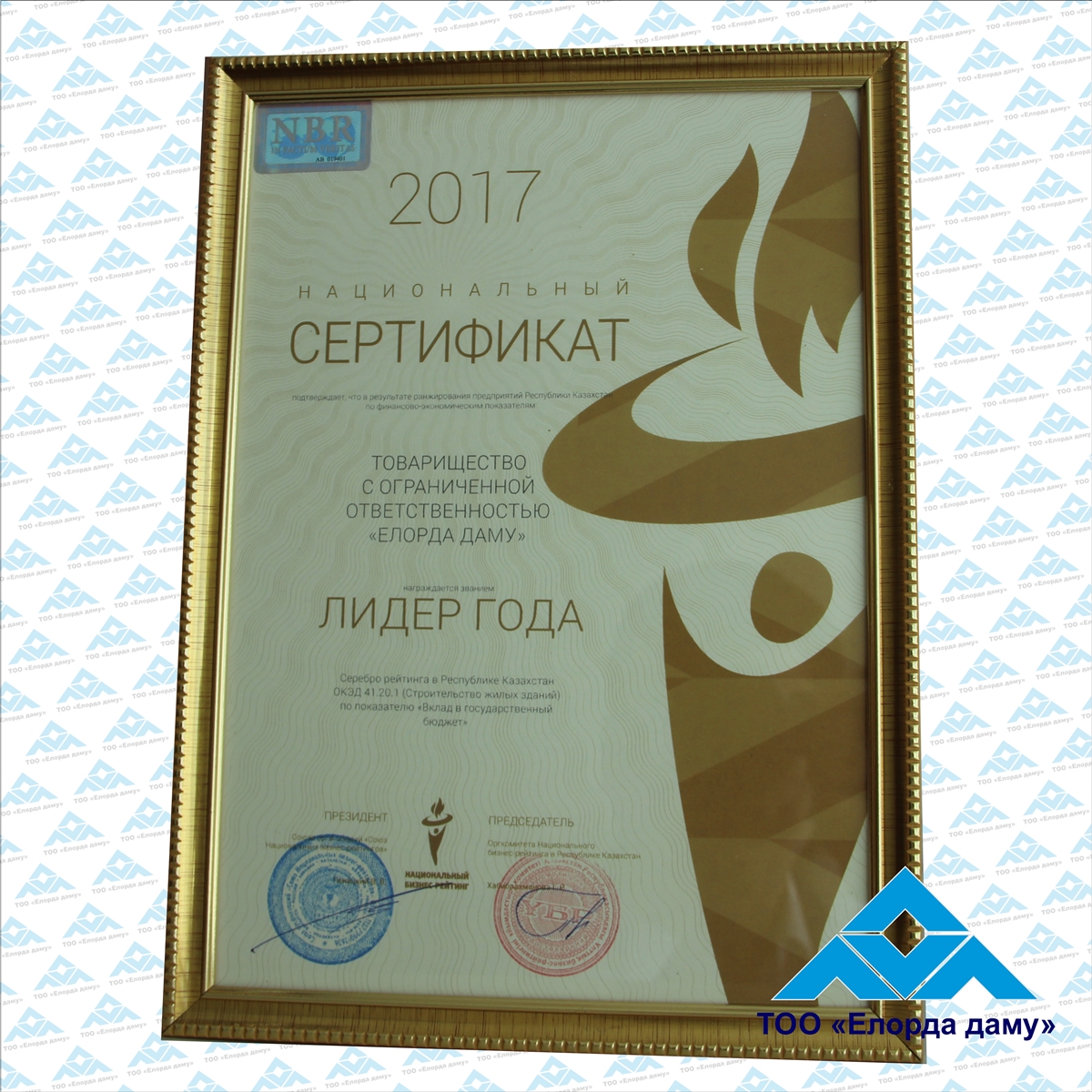 В апреле текущего года ТОО «Елорда даму» награждено Национальным сертификатом Национального бизнес-рейтинга «ЛИДЕР ГОДА» - Серебро рейтинга в Республике Казахстан ОКЭД 41.20.1 (Строительство жилых зданий) по показателю «Вклад в государственный бюджет».