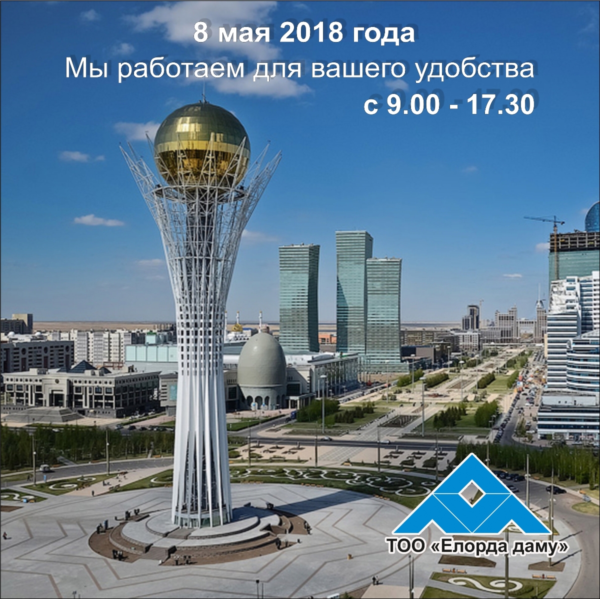 Құрметті достар! «Елорда даму» ЖШС 2018 жылдың 8 мамыр күні сату бөлімінің сағат 09:00 – 17:30 дейін жұмыс істейтінді хабарлайды! Сіздерді Қорғалжын тас жолы, 25/3 үй мекен-жайы бойынша күтеміз.