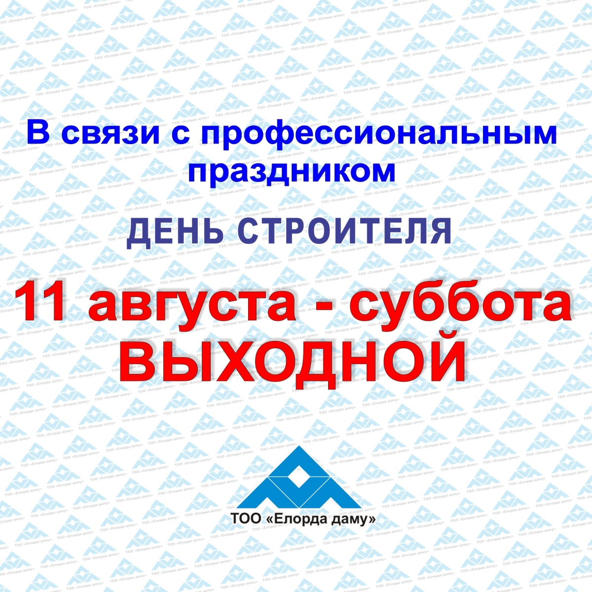 ТОО «Елорда даму» доводит до сведения Клиентов, что в связи с профессиональным праздником – День Строителя, суббота – 11 августа 2018 года - ВЫХОДНОЙ ДЕНЬ.